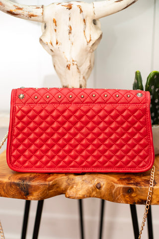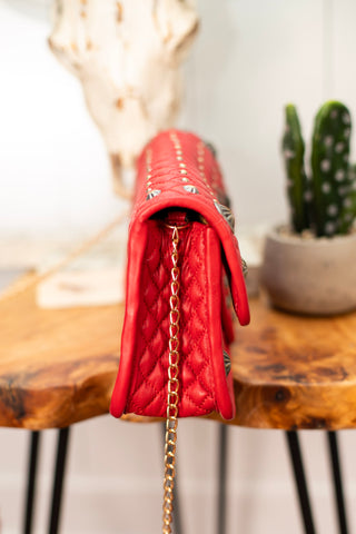 Make a bold statement with the Concho Queen Bag, crafted from genuine quilted leather in a fierce red hue. Stud details on the front add a touch of edgy sophistication, while the snap closure keeps your essentials secure. Inside, a fully lined interior with two pockets helps you stay organized. The chain strap combined with a leather shoulder pad offers comfort and style, perfect for any cowgirl looking to elevate her look. This high-quality accessory is the bag you didn’t know you needed to complete your cowgirl style.