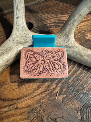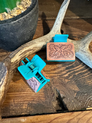 This cowgirl floral hair clip is the perfect addition to your western fashion. Made with genuine leather and a tooled floral design, this turquoise hair clip is both stylish and functional. Upgrade your hair accessories with this must-have cowgirl piece.