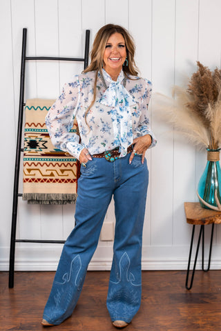 From the office to date night, the Bluebell Grace Blouse is your go-to choice for a feminine and fashionable look. The lightweight material and floral print add a delicate touch, while the attach bow tie and balloon sleeves provide a western and sophisticated style. Perfect for spring, this semi sheer blouse will elevate any outfit.