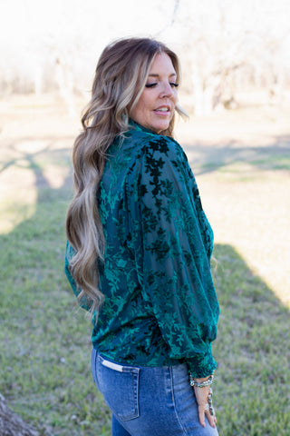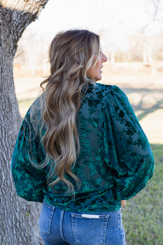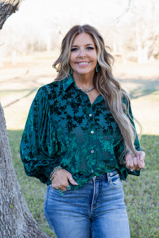 Elevate your style with our Evergreen Elegance Blouse. With semi sheer fabric and velvet burnout detailing, this blouse exudes sophistication. The drop sleeves and angel sleeves add a touch of elegance, while the wide smocking at the wrist and button-up design provide a flattering fit. Perfect for the holiday season or a romantic date night.