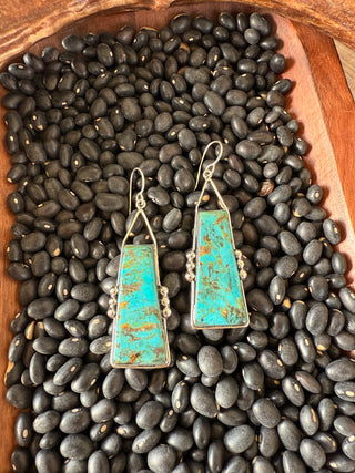 Elevate your jewelry game with High Noon Drops. These .925 sterling silver earrings feature compressed Kingman & Sonoran Turquoise slabs in a smooth setting with silver ball details. These lightweight earrings are perfect for any occasion, adding a touch of western style to your day or night look. Make a statement with these cowgirl inspired earrings.