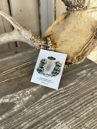 These Silver Spurs Earrings are the perfect addition to any jewelry lover's collection. Made of .925 sterling silver with Kingman & Sonoran Turquoise, these stamped huggie hoop earrings feature a subtle ball design for a touch of western flair. Perfect for daily or evening wear, these medium-sized earrings offer a versatile and stylish cowgirl style.
