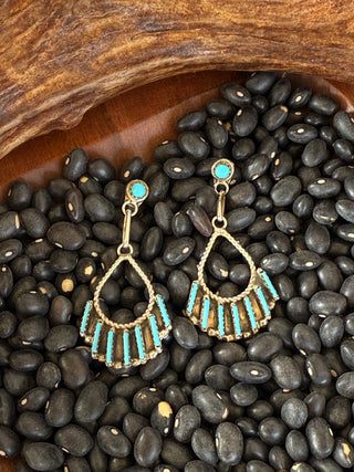 The Zuni Sunrise Earrings are expertly handcrafted by Native artists using .925 sterling silver and Kingman Turquoise. Perfect for daily wear, these post drop dangle earrings are lightweight and affordable, making them an ideal addition to any jewelry collection. Add a touch of western charm to your style with these beautifully crafted Zuni earrings.