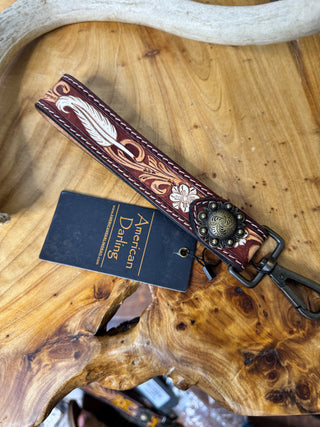 Expertly crafted from genuine leather, this Texas Tooled Wristlet Strap features a stunning hand-painted feather design and concho detail for a perfect western fashion accessory. The convenient wristlet strap allows you to attach keys, wallets, or wristlets with ease. Experience excellent quality and elevate your style with this unique addition to your wardrobe.