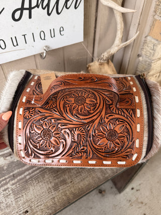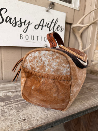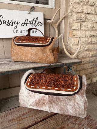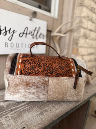 The Ranch Hand Toiletry Bag is a perfect travel companion for cowgirls and cowboys. Made with genuine cowhide and hand tooled leather in a classic western floral design, it offers both style and functionality. With a zipper closure, fully lined interior, clear zipper pocket, and four pockets for bottles, pockets on the side, this bag is perfect for organizing all necessities while on the go. Additionally, the hook allows for easy hanging, making it convenient for use in small spaces. This toiletry bag is a great gift for those who appreciate western style and travel in style. Perfect for graduations or as a gift for anyone who loves to travel.