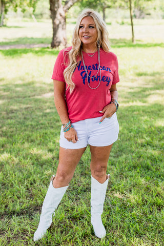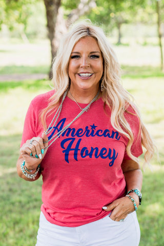 Enjoy a patriotic vintage look with the American Honey T-shirt. Crafted from a blend of 50% cotton and 50% polyester, this unisex tee is designed for lasting comfort and durability. Let your American spirit show with this classic style.