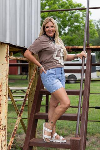 Styled with Studded Denim Shorts & Braidon Sandals