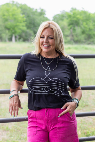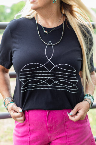 Introducing the must-have Boot Stitch T-Shirt, featuring a stylish screen print and on-trend western boot stitching. With a versatile unisex fit, this shirt is perfect for adding a touch of country charm to any outfit. Don't miss out on the latest fashion trend and grab yours today.