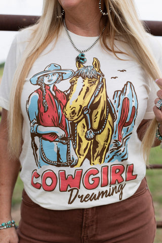 Embrace your inner cowgirl with our Cowgirl Dreaming T-Shirt. Featuring a retro western design screen printed on a comfy unisex tee, this shirt is perfect for any casual occasion. Show off your western pride with this must-have graphic tee.