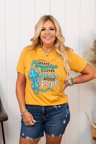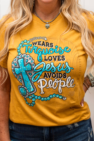 This unisex heather mustard tee features a screen printed "Wears Turquoise, Loves Jesus, Avoids People" graphic. The perfect gift for your girlfriends, this tee is both cute and comfortable. Show off your love for turquoise and Jesus with this unique graphic tee.