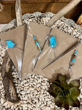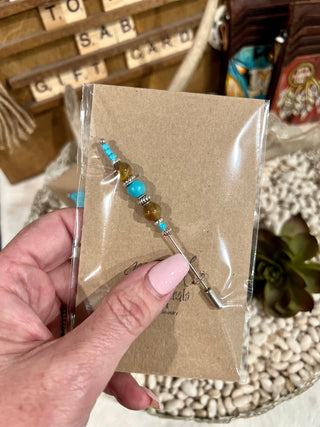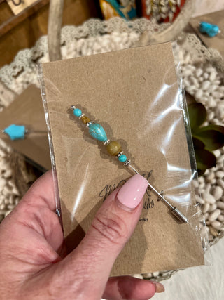 Artisan made hat pins of turquoise magnesite beads.  Each one is unique to your style.  Add to your hat with our Lace or Silk Hat Bands.