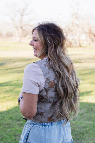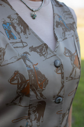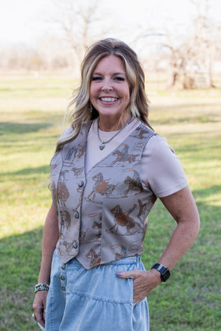 Introducing the Rusty Spur Vest - the perfect addition to your western fashion wardrobe. This lightweight vest features a western graphic print, star concho buttons, and a perfect fit for layering or wearing on its own at summer concerts. With its rodeo style and cowgirl flair, this vest is a must-have for any fashion expert.