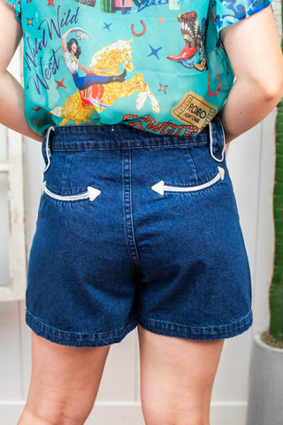 Embrace your inner cowgirl with the Denim Arrow Shorts, crafted from denim for a fresh western look. Featuring distinctive arrow designs on both front and back, these shorts showcase faux back pockets and wide belt loops perfect for your favorite western belt. Designed to fit true to size with no stretch, they offer the ideal length for comfort and style. A must-have for summer concerts and everyday western fashion, these shorts combine authentic details with modern flair to elevate your wardrobe.