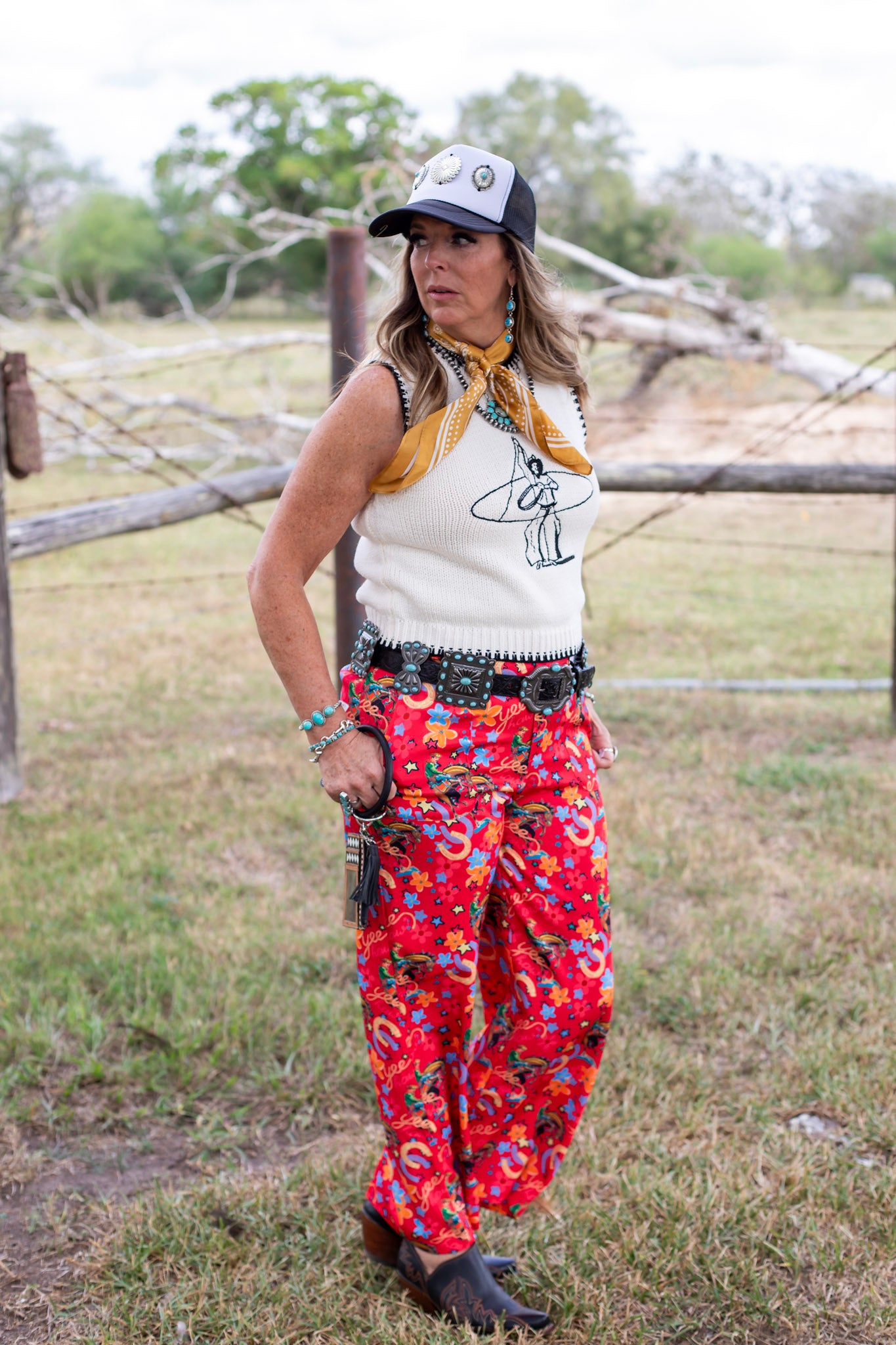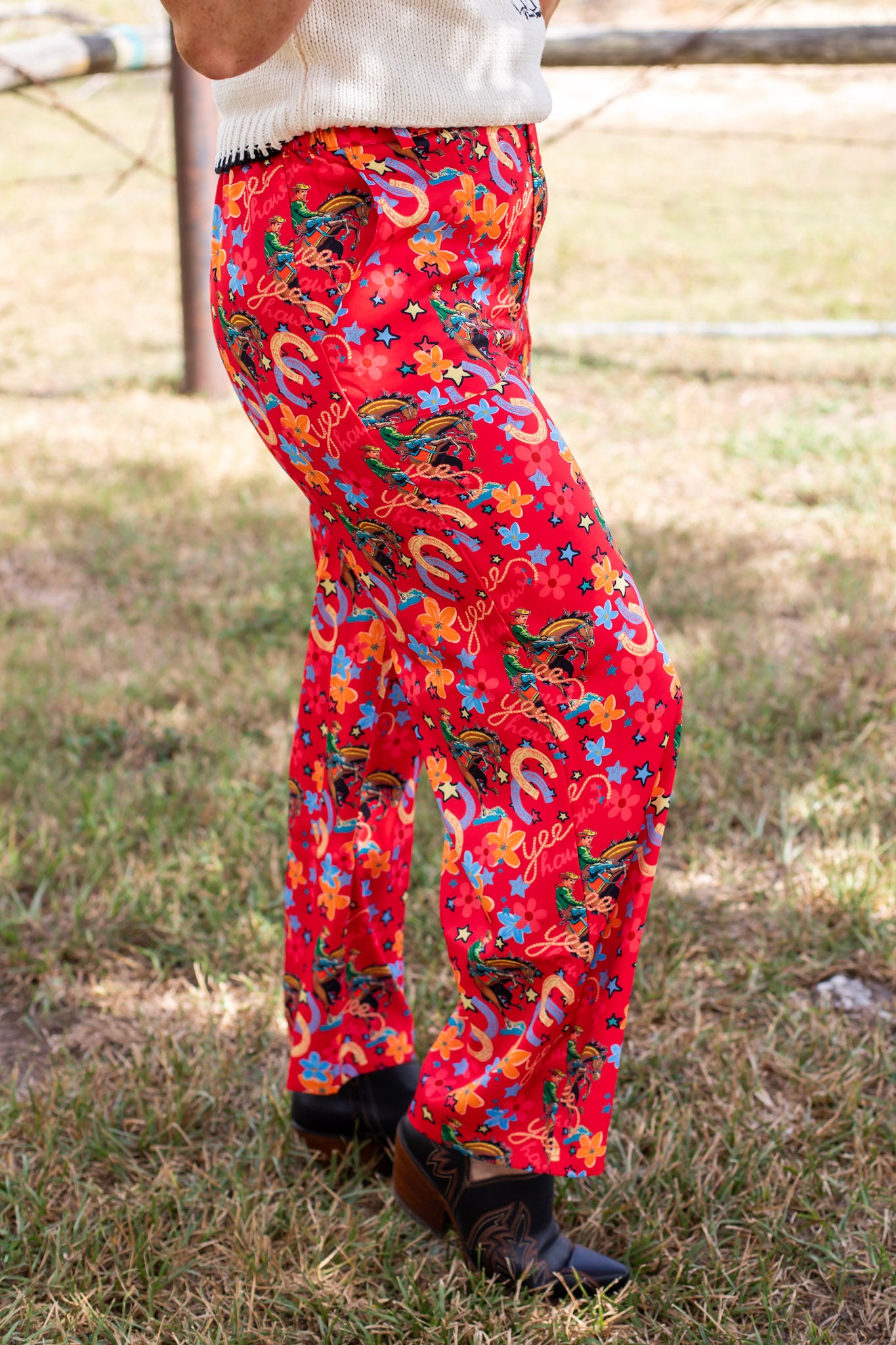 Embrace your inner cowgirl with the Yeehaw Rodeo Pants, featuring a vibrant red horseshoe cowboy print that stands out in any crowd. These high-waisted pants offer a comfortable fit with elastic at the back of the waist, complemented by practical pockets and belt loops. Lightweight and stylish, they’re perfect for NFR events, western fashion, and fall wardrobes alike—bringing high-class cowgirl flair to every step you take.