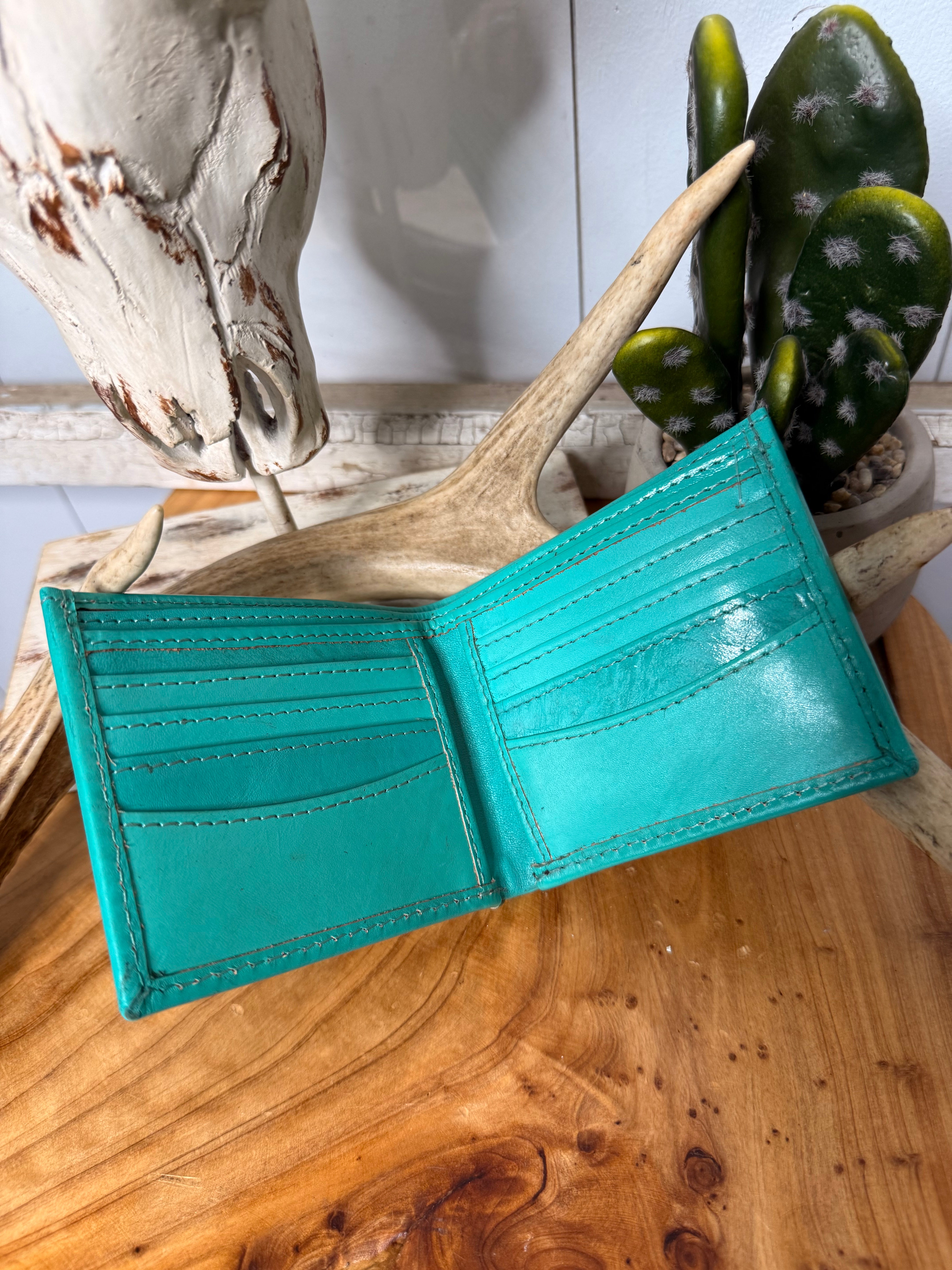 Crafted from genuine tooled leather on both sides, the Cowtown Bloom Wallet in turquoise combines durability with striking western style. This bi-fold design features 8 card slots, 2 spacious bill compartments, and extra pockets for effortless organization. Its compact size makes it a perfect match for smaller bags, adding a vibrant pop of color without sacrificing function. Elevate your everyday essentials with this must-have accessory.