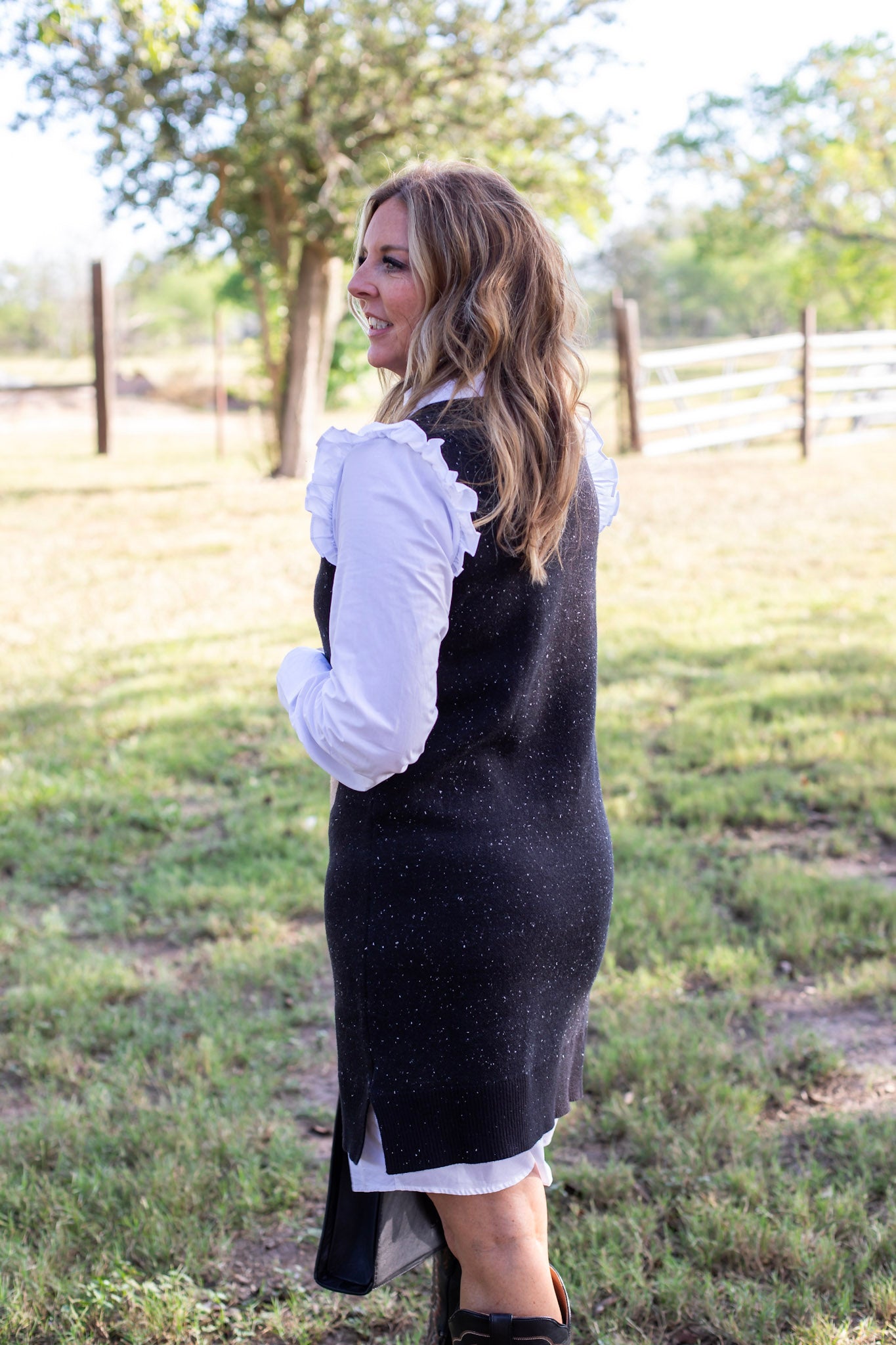 Elevate your western wardrobe with the High Horse Sweater Dress, a high-quality knit sweater layered over a built-in long sleeve cotton blouse. Featuring intricate stitching on the collar, wide cuffs, and delicate ruffle details on the shoulders, this medium-weight dress offers a sophisticated, polished look. The subtle peek of shirt tails adds charm while maintaining comfort. Designed to fit true to size, it embodies high-class cowgirl style and is perfect for making a statement at the NFR or any fashionable occasion. Embrace timeless western fashion with effortless elegance.