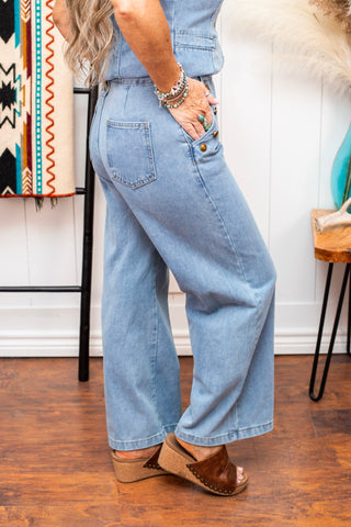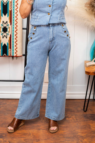 Be effortlessly chic and on-trend with our Blue Jean Babe Set. This light denim two piece vest and pant set features a sleeveless vest with faux front pockets and darting for a perfect fit. The matching wide leg crop pants are high rise with button detail on front pockets. Wear together or separately for a versatile western office or cowgirl look. Made with clean denim for a stylish spring staple.