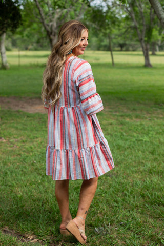 Effortlessly transition from day to night in the Frontier Firecracker Dress. This striped dress features a stunning Aztec design and playful tiered ruffle, all while providing the ultimate convenience of pockets. Its lightweight material and versatile style make it a must-have for any occasion, from graduations to weddings. Embrace your Western charm and cowgirl style with this perfect addition to your spring fashion.