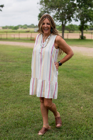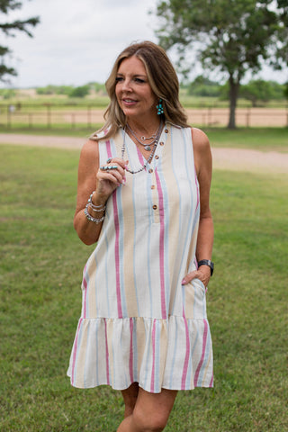 Expertly designed with vertical, multi colored stripes, this Summer Stripe Midi Dress is perfect for any summer occasion. The sleeveless design and lightweight fabric make it ideal for warm weather, while the functioning buttons and v-neck with collar add an elegant touch. With a flattering ruffle at the bottom and pockets for convenience, this dress can be dressed up or down and is fully lined for comfort. Perfect for your next vacation, this dress is a must-have for any wardrobe.
