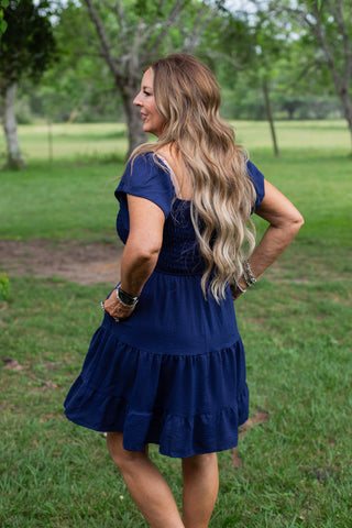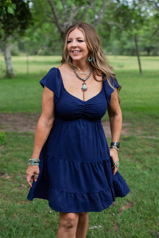 Introducing the must-have Twilight Bloom Dress! This navy woven dress features flutter sleeves, a smocked bodice, and a sweetheart neckline for a flattering fit. With pockets and a lightweight, tiered design, it's perfect for any spring occasion. Dress it up with wedges or keep it casual with sneakers. Ideal for graduations, weddings, or any event where you want to look and feel your best. Don't miss out on this versatile and stylish addition to your wardrobe!