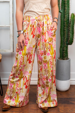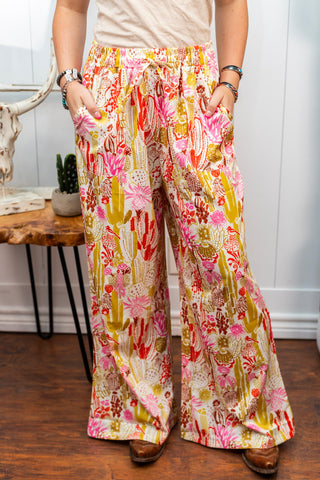 Step into summer with the Boho Bloomscape Pants, showcasing a vibrant cacti print that brings a fresh western flair to your wardrobe. These wide-leg pants feature a comfortable elastic drawstring waist and handy pockets, combining style with practicality. Their lightweight, flowy fabric makes them ideal for workdays, travel adventures, or a charming date night. Perfect for embracing cowgirl style while staying cool and confident all season long.