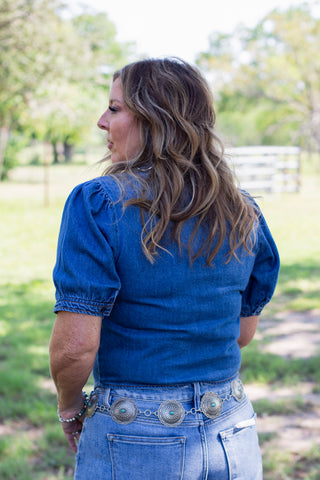 Elevate your fall wardrobe with the Cowgirl Charm Top—a true denim crop button-up featuring stylish puff sleeves and a fitted cut that flatters every curve. Perfectly blending western business and cowgirl vibes, this top pairs effortlessly with jeans for a classic denim-on-denim look or dresses up beautifully with tailored pants. Embrace fall’s transition in style with this versatile, fashion-forward essential.