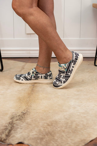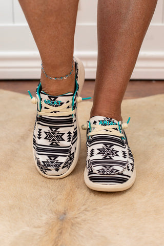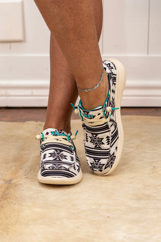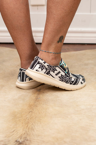 Introducing Hilo Shoes by Ariat - the perfect blend of style and comfort. With a fun, Southwestern design inspired by the Chimayo weaving tradition, these shoes are a must-have for any collector. Enjoy ultra-cushy support in every step with our limited-edition Stark Southwest Hilo shoes.