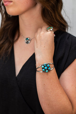 The Blue Spirit Blossom Cuff is a native handcrafted treasure made from .925 sterling silver and adorned with a stunning seven stone turquoise cluster. Its smooth setting and detailed silver work create a refined look, while the split shank design ensures a comfortable fit. This versatile cuff is perfect for layering or wearing alone as stylish arm candy. Whether dressing up or down, it captures the essence of western and cowgirl style with a classy, heirloom-quality finish that will elevate any outfit.