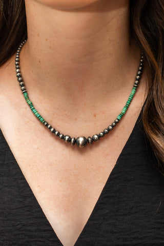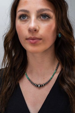 The Desert Pearl Necklace is a handcrafted treasure featuring .925 Sterling Silver Pearls paired with vibrant turquoise Heishi beads in gorgeous blues and greens. Its graduated pearls and accent Sterling Silver Saucer Pearls offer a perfect length for layering. This western-inspired piece embodies classy cowgirl style, making it a must-have accessory that effortlessly dresses up or down any outfit.