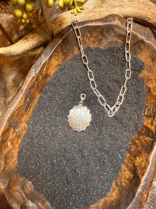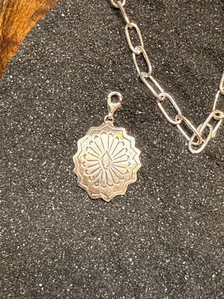 Crafted from .925 sterling silver with a matte finish, the Driftwood Concho charm features intricate stamped details that capture authentic western and cowgirl style. Its lobster claw clasp makes it easy to add to any necklace or bracelet, creating a bold statement piece that elevates your look with timeless southwestern flair.