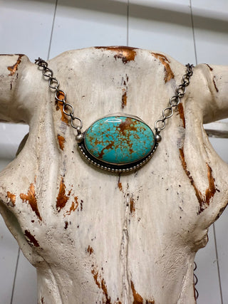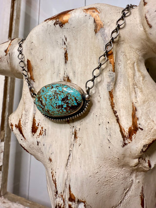 The Number 8 River Rock Necklace showcases a striking large Number 8 Turquoise stone, native handcrafted and set in polished sterling silver. Its smooth setting is framed by intricate bead and rope details, blending classic western style with elegant craftsmanship. The adjustable chain ensures comfortable wear and easy layering, letting you create a unique look every time. Embrace the beauty of one-of-a-kind stones with this timeless piece that adds a bold, authentic touch to any outfit.
