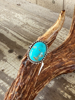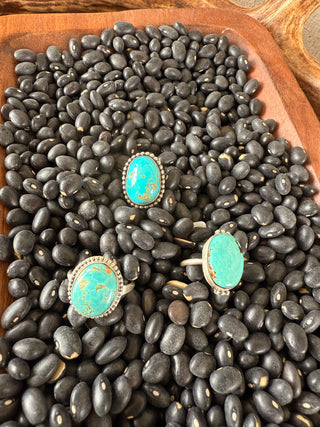 Elevate your western jewelry game with Rambler Rings. Each .925 sterling silver ring features handpicked Turquoise, crafted by Native artisans and set in a smooth bezel with a rope border and bead detail. Perfect for daily wear with a cowgirl style.