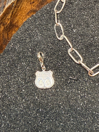 Crafted from .925 sterling silver, this Route 66 Charm features the iconic Kansas US 66 stamp, capturing the spirit of the American West. Its secure lobster clasp makes it easy to add to any bracelet or necklace. Perfect for cowgirls and lovers of western style, this charm is an ideal gift to celebrate Kansas pride and timeless adventure.
