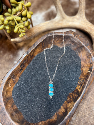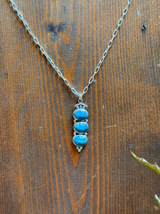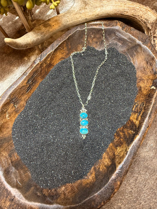 Crafted from .925 sterling silver, the Triple Stone Trail Necklace features stunning Kingman and Sonoran Turquoise oval stones set in a smooth, elegant setting accented with silver ball details. This drop pendant necklace embodies unique western style, perfect for layering or wearing solo to elevate your cowgirl jewelry collection with authentic southwestern charm.
