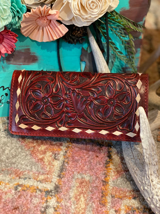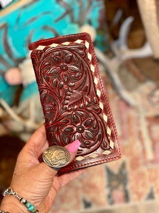 American Darling Wallet is made with genuine leather. Gorgeous handcrafted tooled detail with black inlay and buck stitch. Comes with 7 card slots, 3 large pockets and money slot.