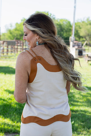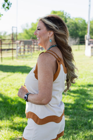 The Desert Dune Top is the epitome of classy western style. Crafted with high quality linen, this top features a unique wave hem and double rope straps. Fully lined for comfort, it pairs perfectly with wedges or boots for a polished look. Complete the ensemble with the matching shorts (sold separately). Transform your wardrobe with this western coquette top.