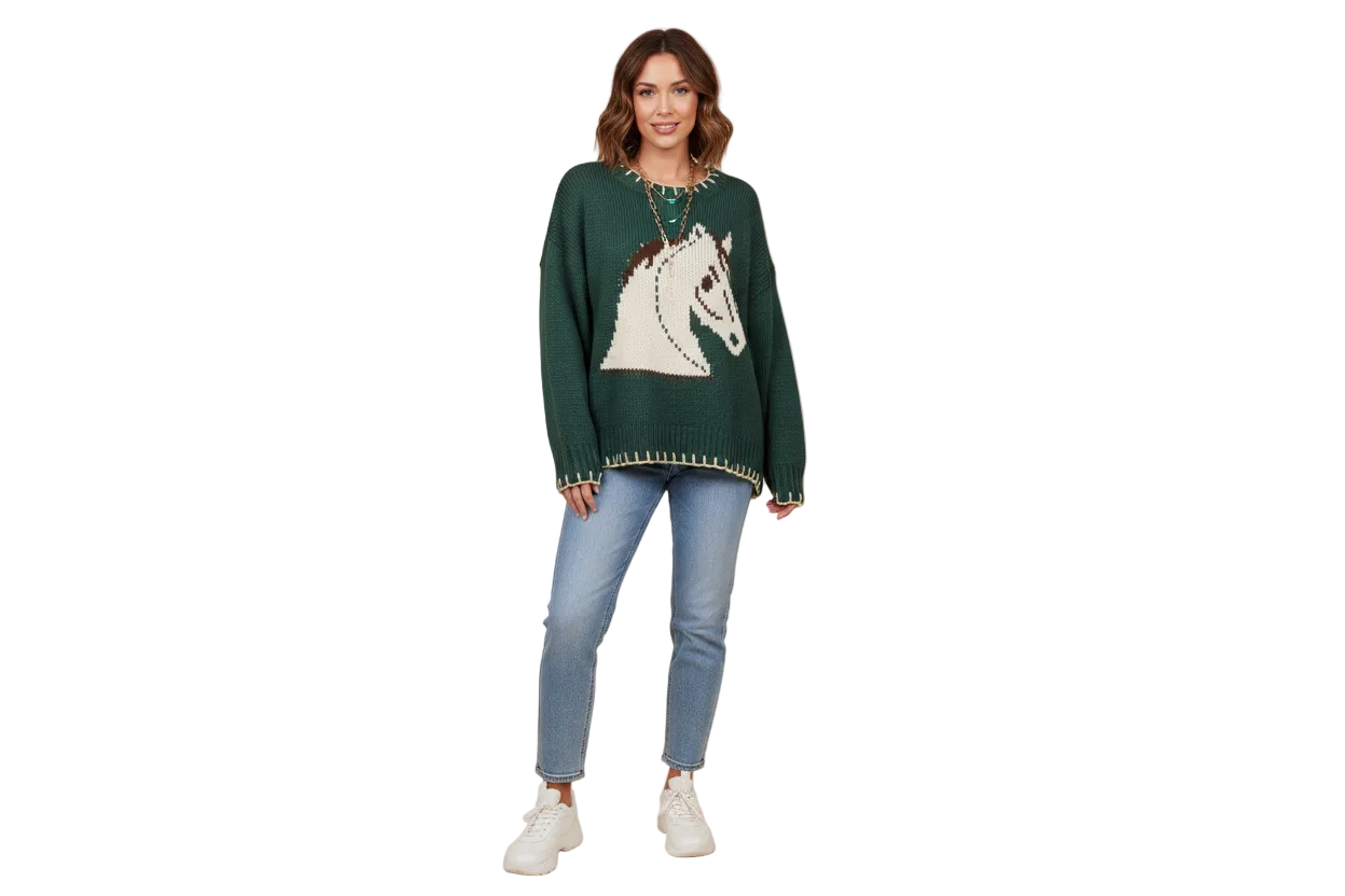 Saddle up in style with this oversized knit sweater that captures authentic western charm. Featuring an eye-catching horse head design and distinctive whip stitching details along the hemlines, this piece delivers genuine cowgirl flair. Crafted from top-notch quality materials, it's versatile enough to layer through chilly months or wear solo as spring arrives. Whether you're heading to the stock show, rodeo, or just living your best western life, this sweater proves that true style never goes out of fashion. Comfortable, durable, and undeniably statement-making—your new go-to for effortless ranch-ready elegance.