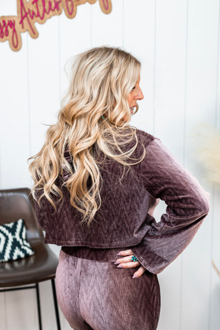 Experience luxury and comfort with this rose taupe velvet crop top. Its long sleeves make it perfect for lounging in style. Complete the look by pairing the top with matching pieces sold separately.