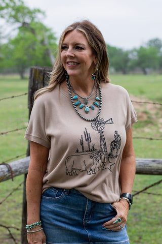 Introducing the Stampede Top, the perfect addition to your spring wardrobe. This lightweight, knit sweater top features a western graphic stitched on and a relaxed, loose fit. Channel your inner high class cowgirl with endless styling options. Embrace western fashion this season with the Stampede Tank.