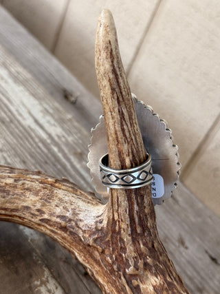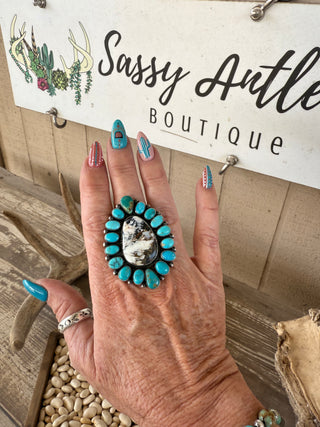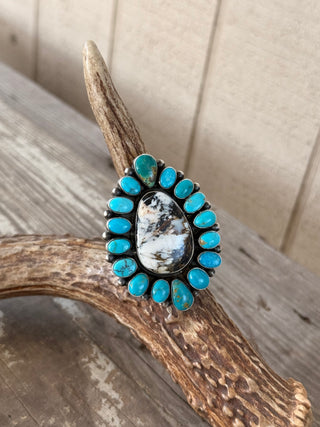 The Blue Buffalo Ring is a stunning piece of native handcrafted jewelry made from .925 sterling silver. It features 16 Kingman Turquoise stones surrounding a White Buffalo stone, all set in a smooth, with ball detail. This stamped, single shank ring is perfect for collectors, jewelry lovers, and those looking to add a touch of western cowgirl style to their wardrobe. Make a statement with this unique and beautiful ring.